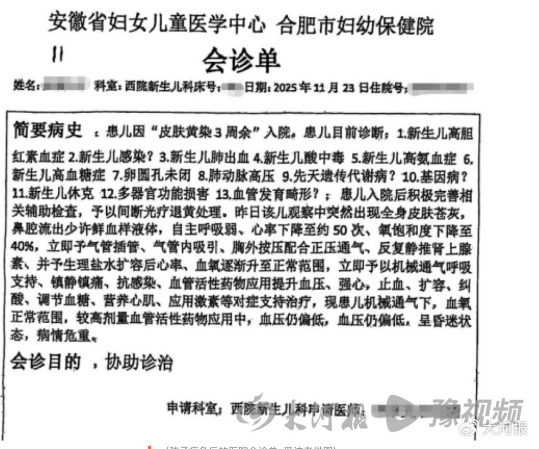 陈先生介绍,孩子于2025年10月27日在合肥市妇幼保健院西区剖宫产出生,出生后因黄疸未退,于11月20日到该院新生儿科住院,接受蓝光治疗。由于新生儿科实行封闭管理,不允许家属陪护,仅每周一、三、五通过电话告知孩子情况。21日,医院电话告知孩子一切正常,黄疸值虽有反弹但无需担忧。