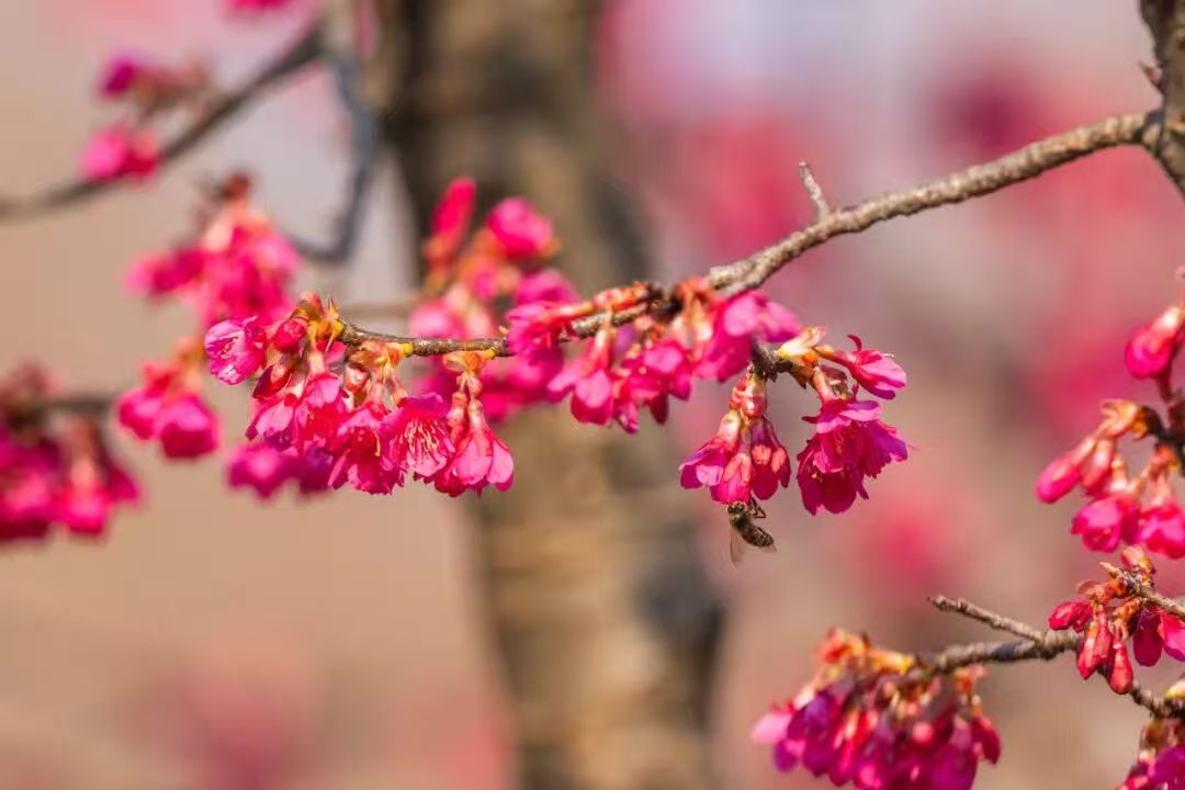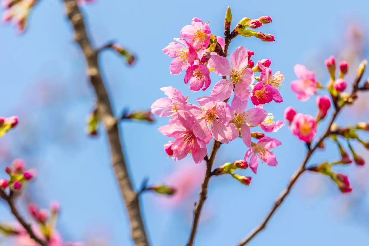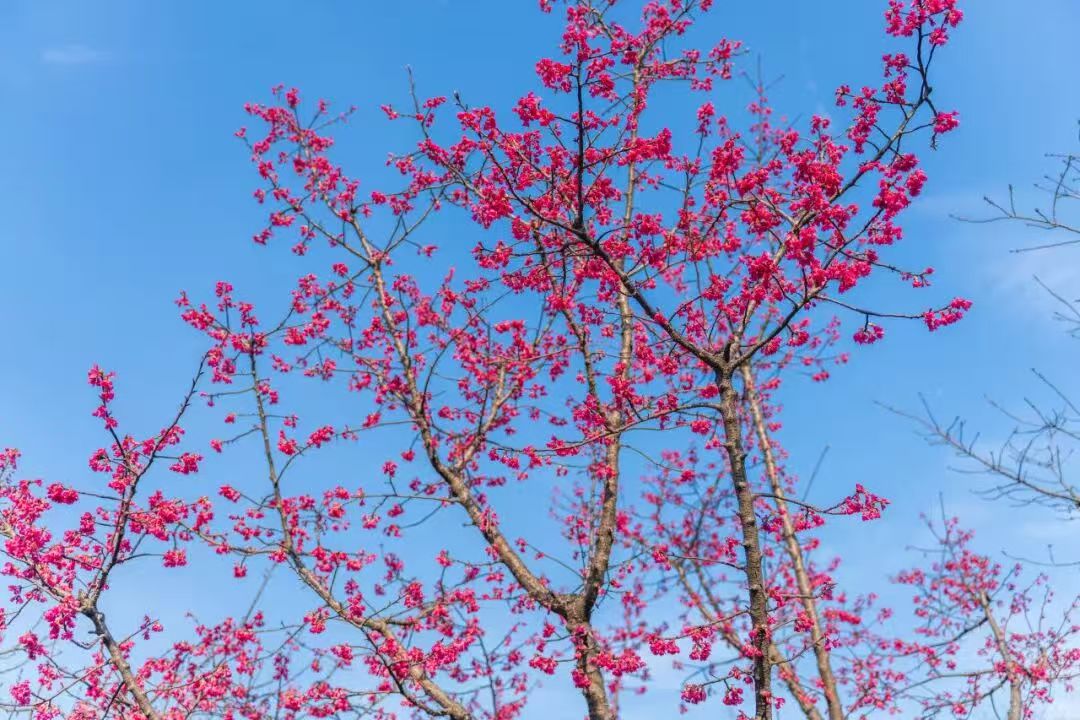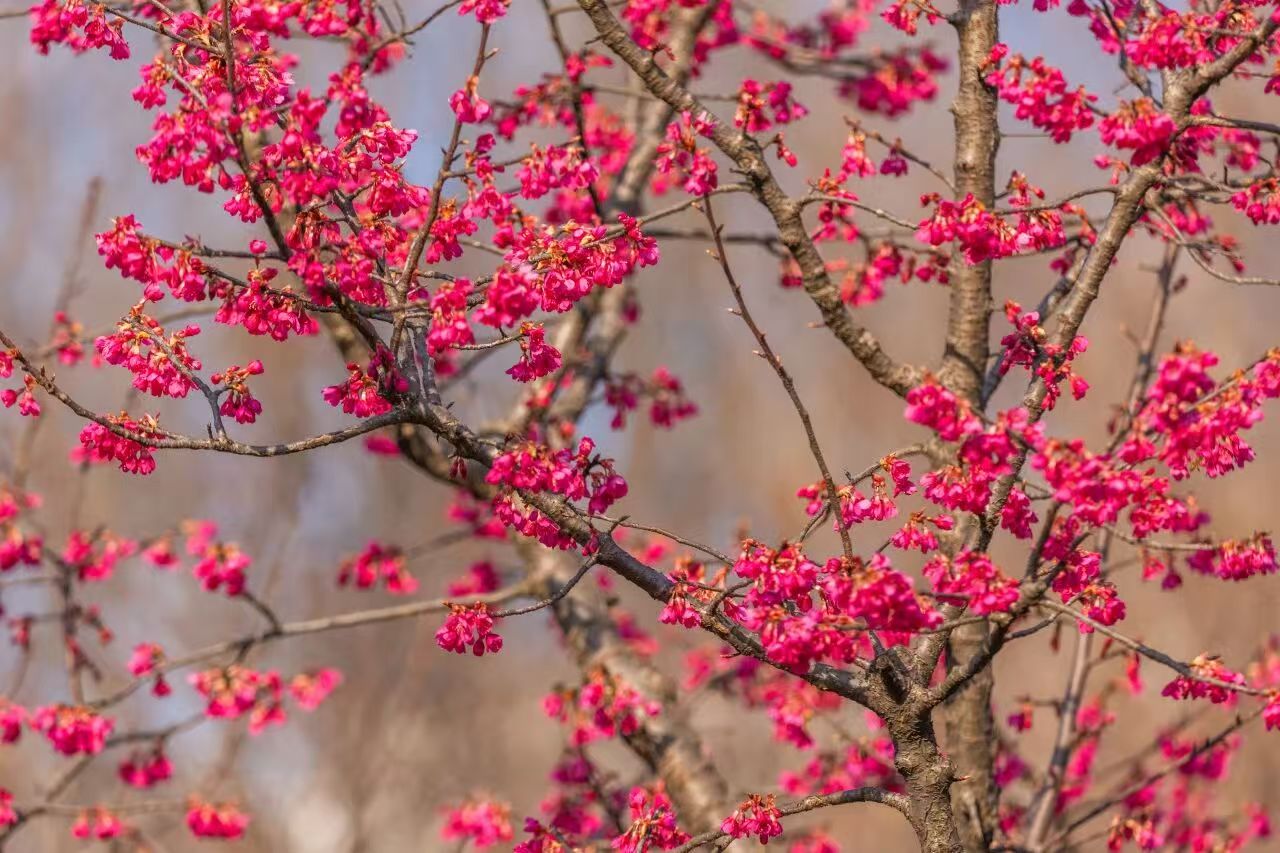 这抹亮眼的“中国红”来头可不小!2024年底,玄武湖景区与南京林业大学生命科学院携手,共建了南京林业大学樱花研究中心玄武湖基地。南京林业大学生命科学学院向玄武湖景区捐赠了十株国产樱花“胭脂绯”。如今,春意渐浓,这批新引进的国产樱花已悄然绽放,为玄武湖的春日增添了一抹亮丽的色彩。值得一提的是,“胭脂绯”可是地地道道的“中国制造”,是钟花樱桃与尾叶樱桃的杂交品种。作为我国科研人员自主选育的杂交品种,它花色绯红亮丽、树形舒展优美,妥妥的国产樱花“颜值担当”!除了“胭脂绯”,另一款国产好樱“飞寒”也在蓄力中,预计3月上旬盛开,坐等它的花海惊喜。
