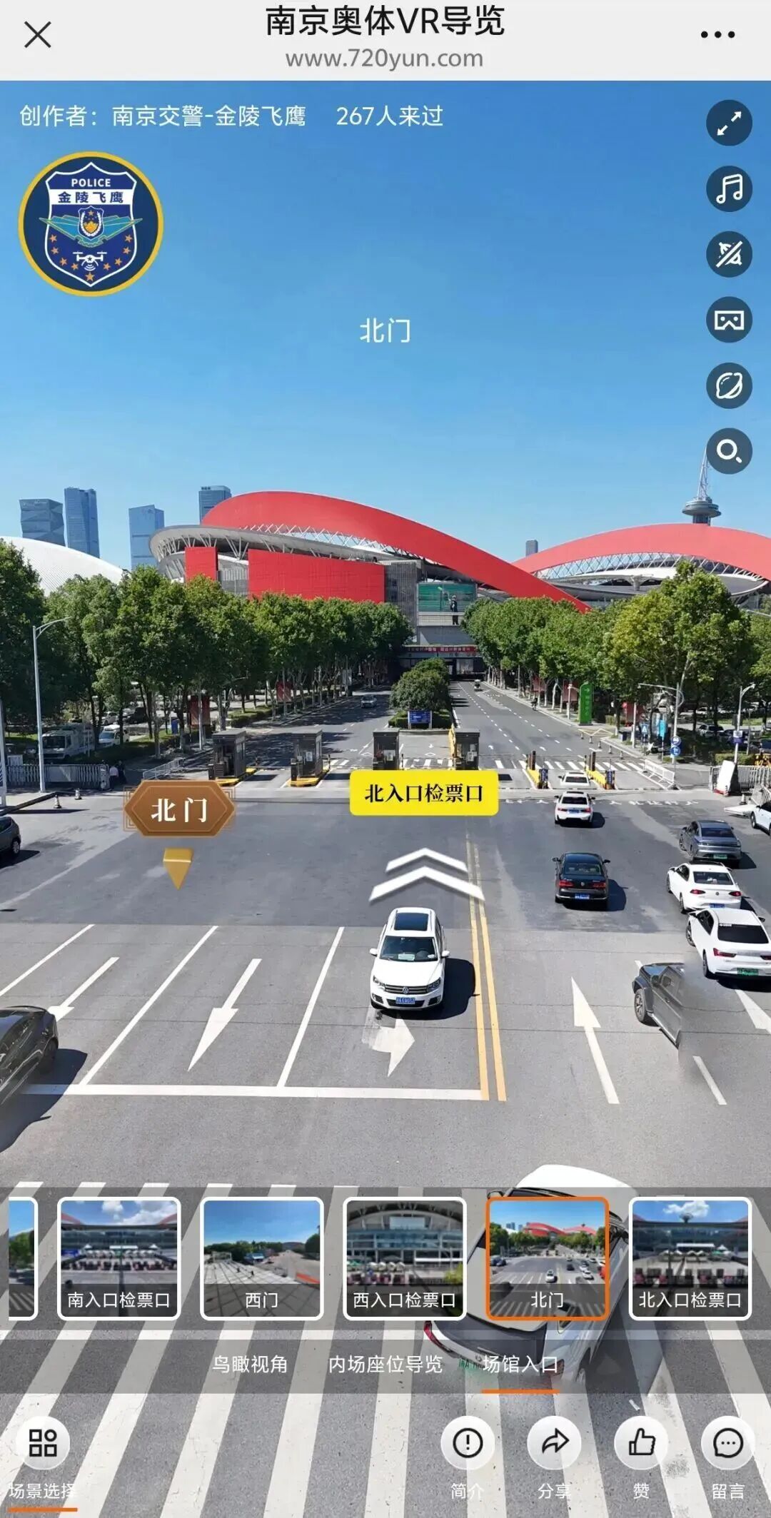 为了方便数万球迷快速进场、快速就座,南京交警创新推出短信链接“VR”全流程指引,为观赛球迷提前实景“预演”,精确导航,让出行选择更直观便利。扫描二维码即可进入全景导览,根据自己所在位置,带您快速找到进出口、检票口,到达座位区域。