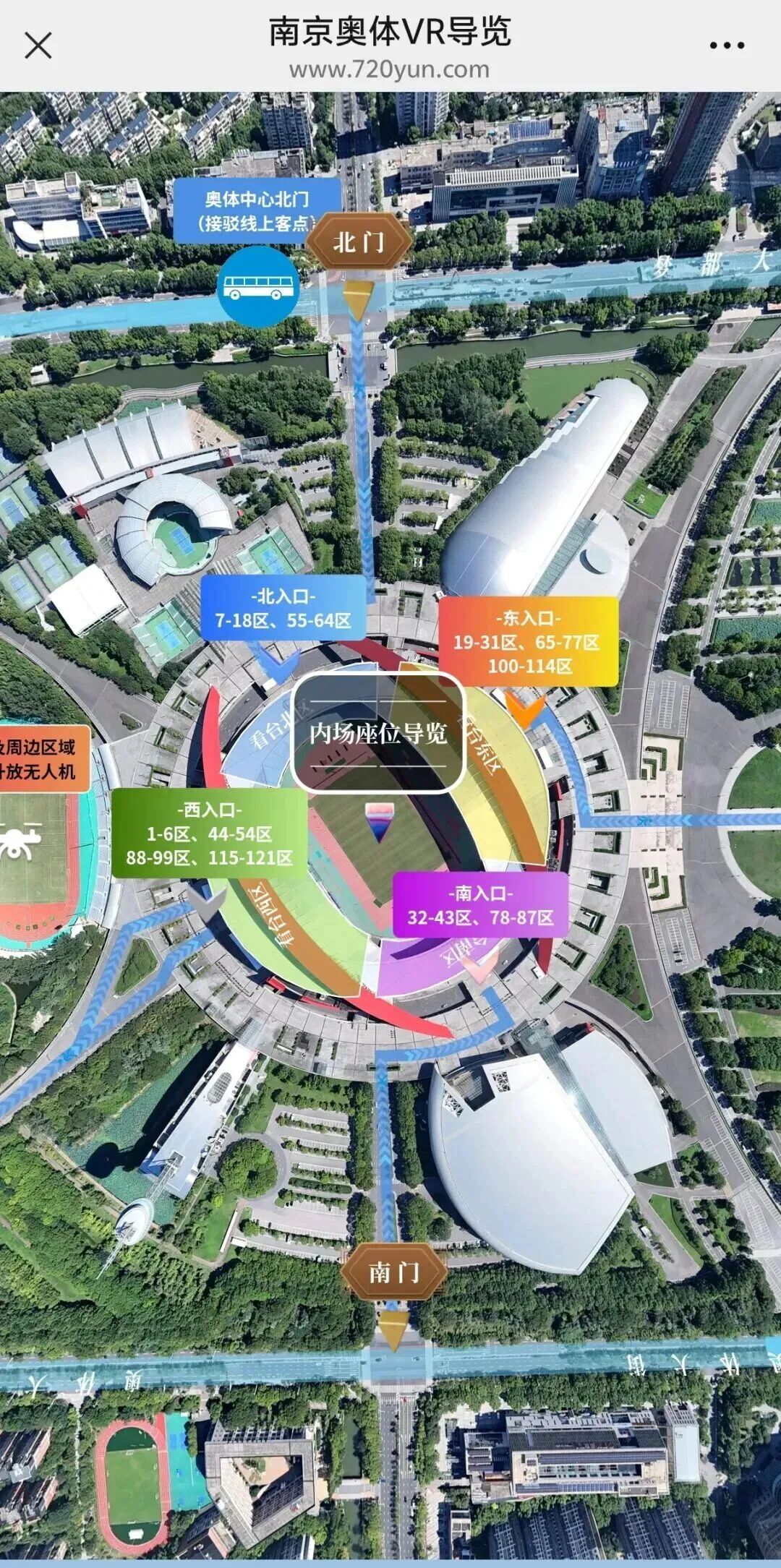 这个VR链接主要提供外围出行导航和内场分区找座位等服务,首个页面即可全景浏览奥体中心周边地铁线路、出入口详情,以及新城大厦、江苏大剧院、新地中心、元通博览中心等多个共享停车场点位,所有停车场均支持一键导航。